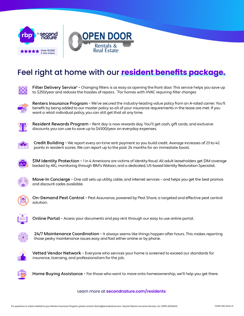 *All Open Door Rentals and Real Estate residents are enrolled in the Resident Benefits Package (RBP) for $55.00/month which includes liability insurance, credit building to help boost the resident’s credit score with timely rent payments, up to $1M Identity Theft Protection, HVAC air filter delivery (for applicable properties), move-in concierge service making utility connection and home service setup a breeze during your move-in, our best-in-class resident rewards program, on-demand pest control, and much more! More details upon application.
